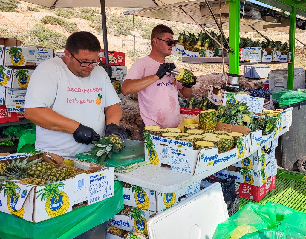A legtöbben az első ingerekből és élményekből felocsúdva döbbennek rá, hogy szinte mindenki ugyanezzel a folyamattal kezdi a néhány órás ott tartózkodását, a kiüresedett, hőségben fonnyadozó ananászhéjak pedig ott hevernek a közelben napozók mellett is.